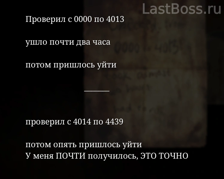 Согласно заметке с кодом, мертвый человек пытался подобрать пароль для клавиатуры методом перебора. Перевернув страницу, ты увидишь, что он сдался и убежал, когда дошел до 4439. Он думал, что почти разгадал код.