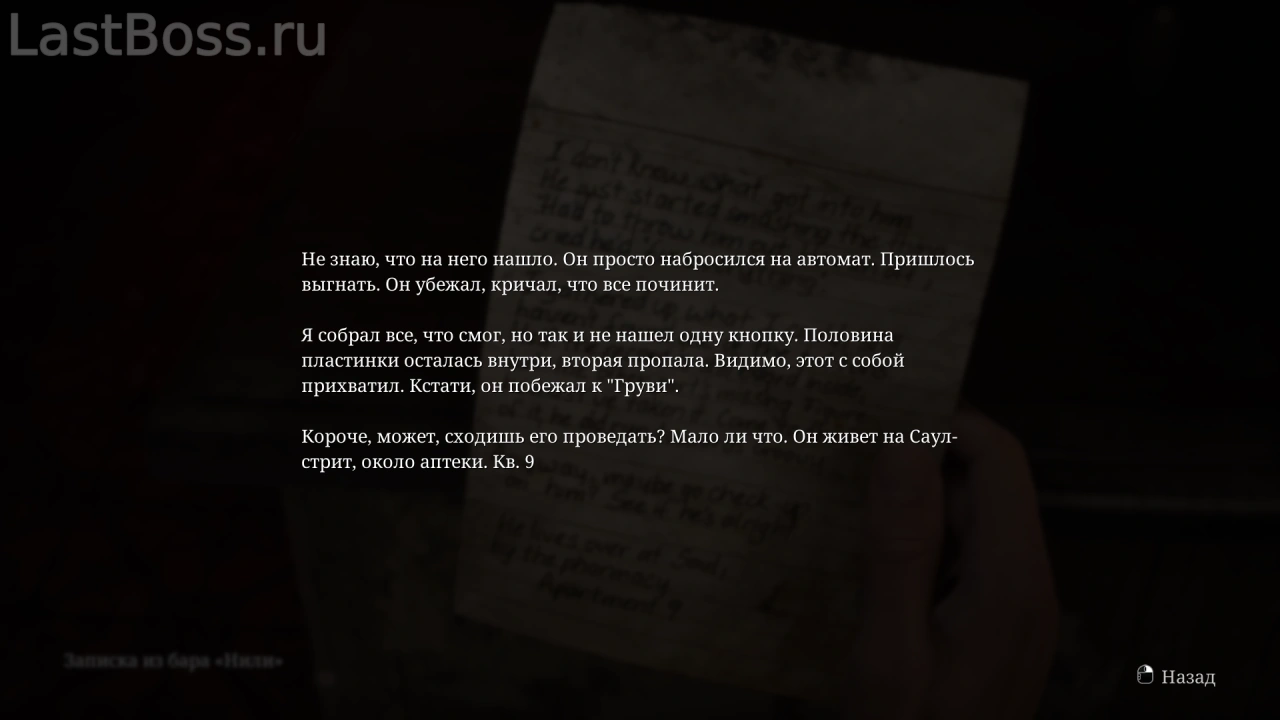 - Вставь кнопку от музыкального автомата, запихни жетон из бара Нили и выбери трек C2 — это единственная уцелевшая песня.