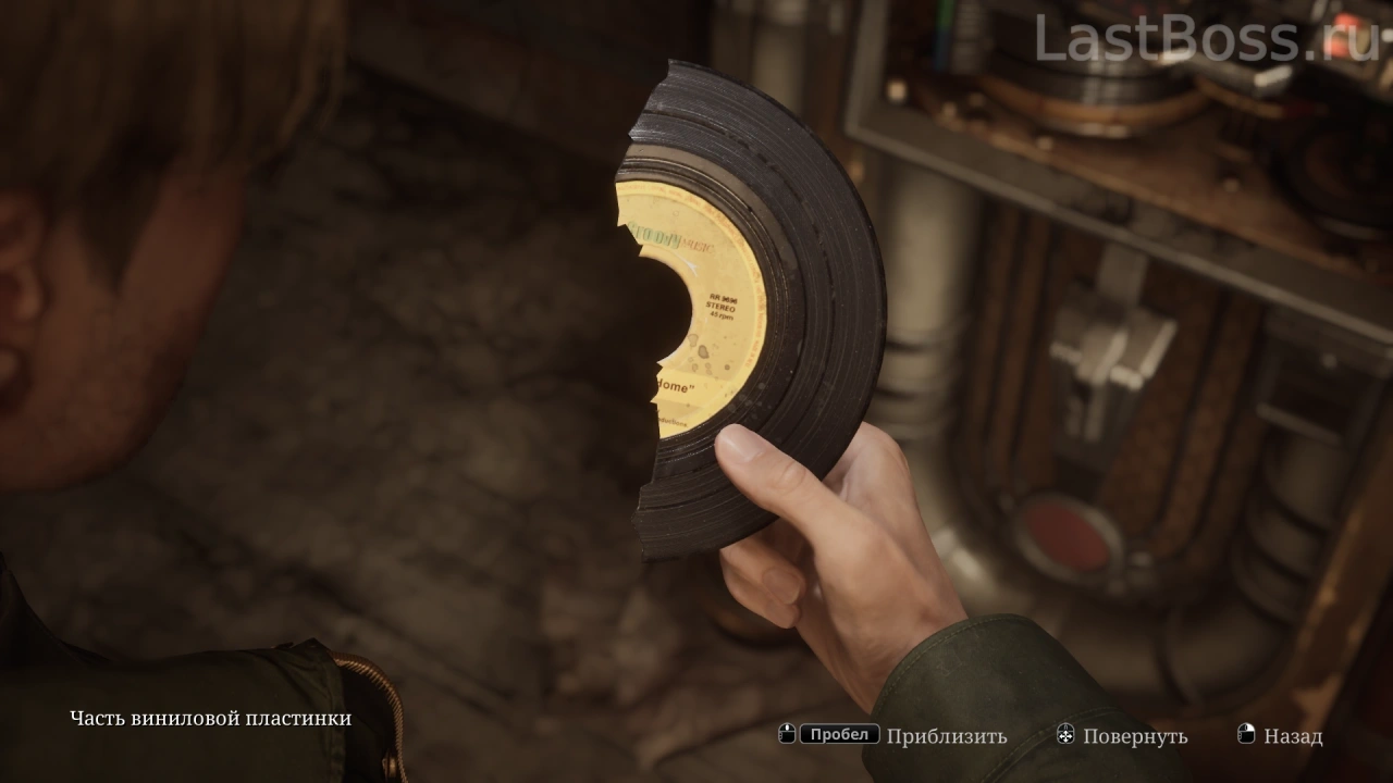 Внутри снимай покрывало с автомата и забирай часть виниловой пластинки. На стойке лежит записка с историей о том, кто её сломал и то что он после этого пошёл в Груви Мьюзик.
