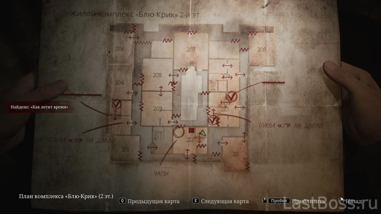 Когда впервые попадаешь в «комнату с часами» в Блю-Крик, Apt. 212, дверь спальни закрыта. Комната меняется по мере получения стрелок часов. После получения решения головоломки с мотыльками и получения секундной стрелки, квартира будет разрушена, а фотография появится на полу спальни.