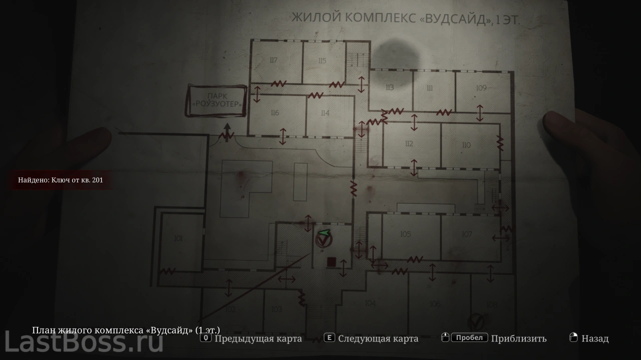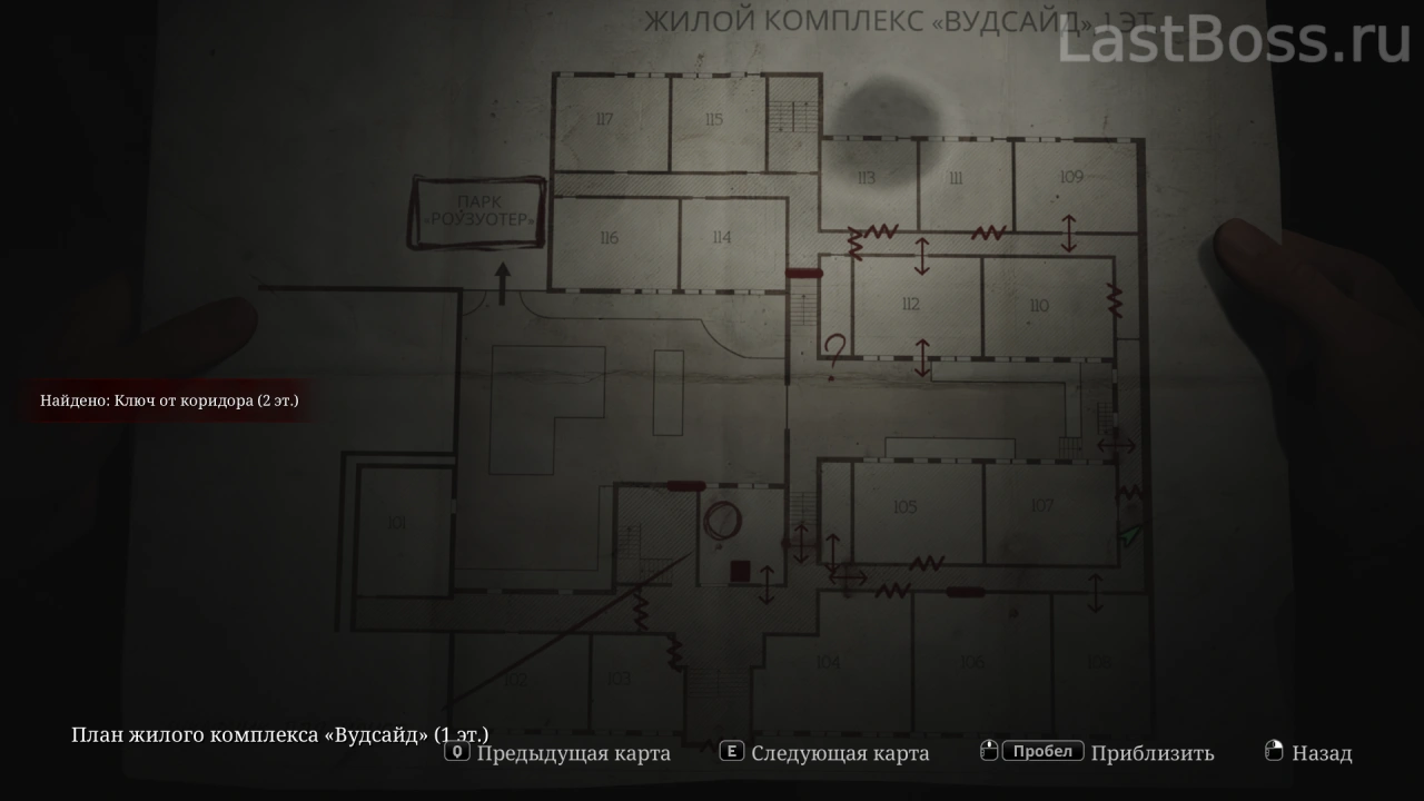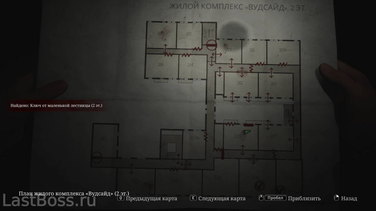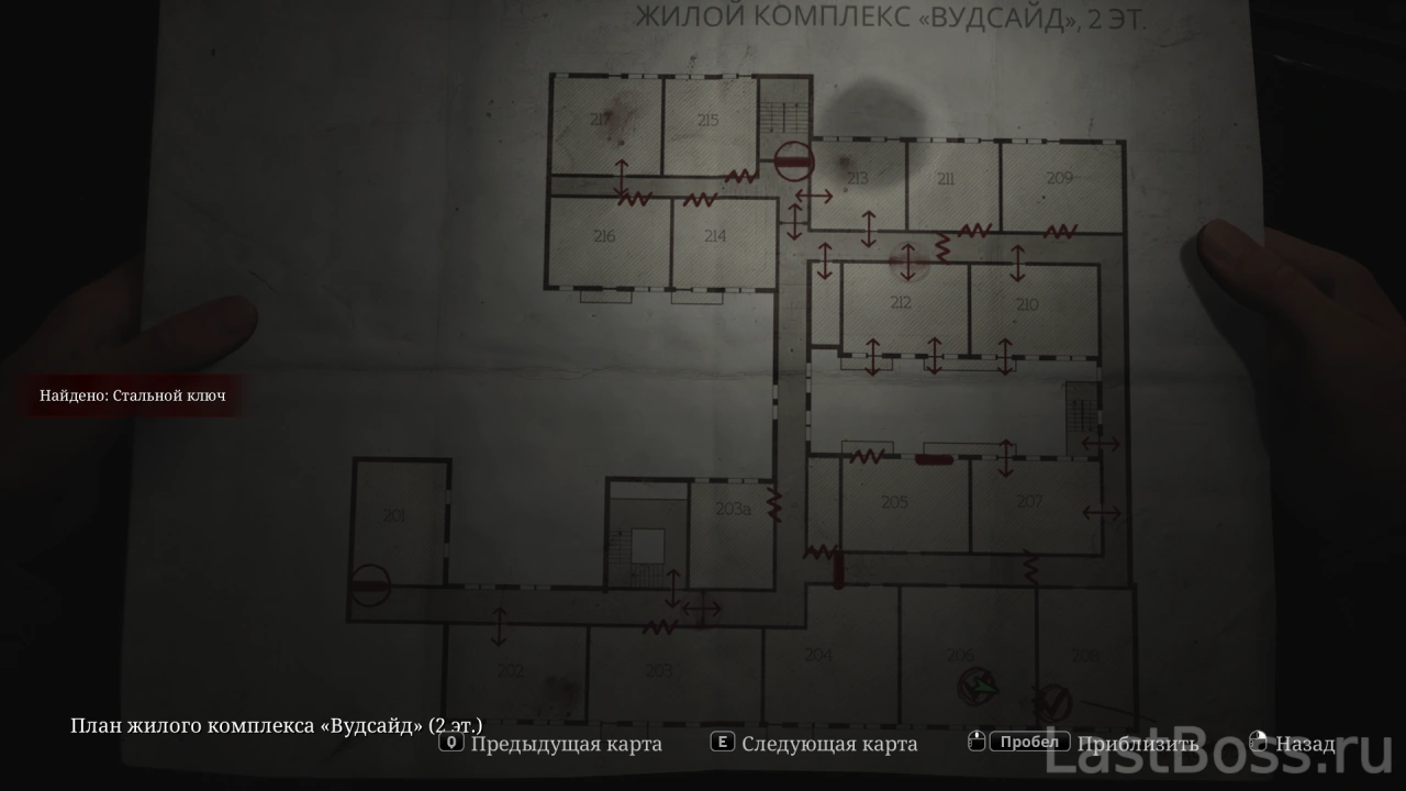 Используй тележку во дворе, чтобы попасть в открытое окно квартиры 212. Пройди на восточный конец коридора и забери ключ через противоположную сторону ворот. После этого восточная дверь в лобби разблокируется, а ключ от коридора второго этажа можно найти в углу за воротами.