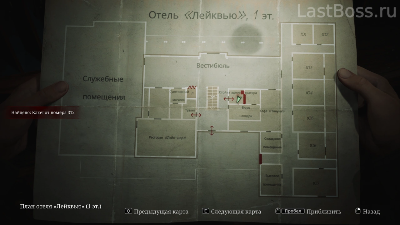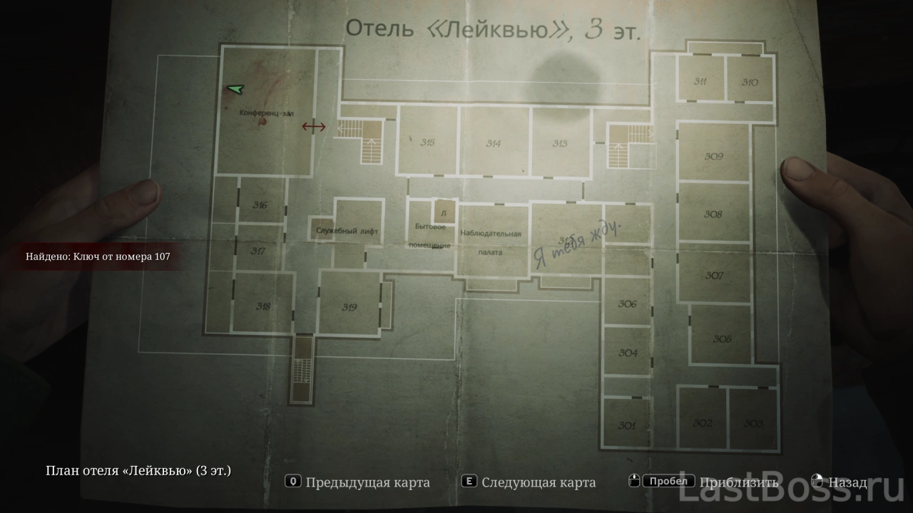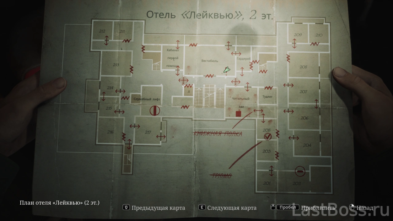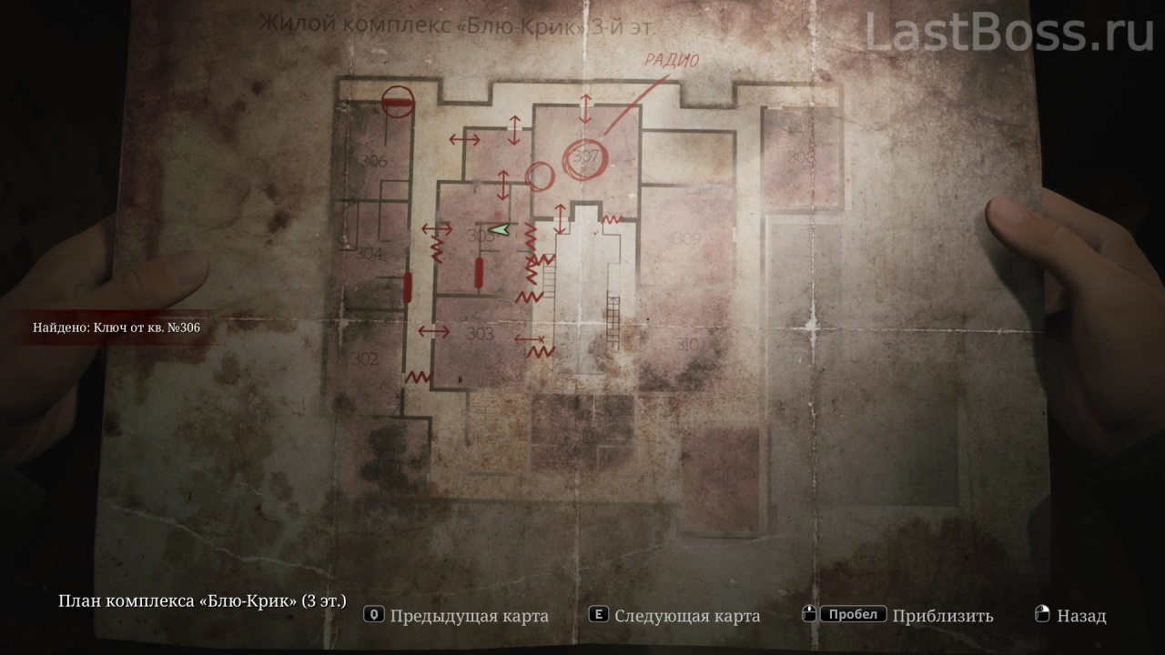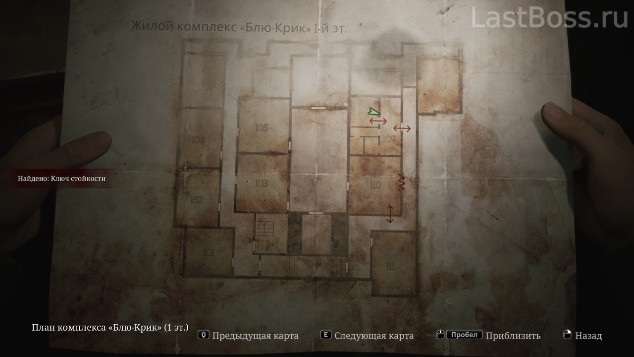 Используй тележку во дворе, чтобы попасть в открытое окно квартиры 212. Пройди на восточный конец коридора и забери ключ через противоположную сторону ворот. После этого восточная дверь в лобби разблокируется, а ключ от коридора второго этажа можно найти в углу за воротами.
