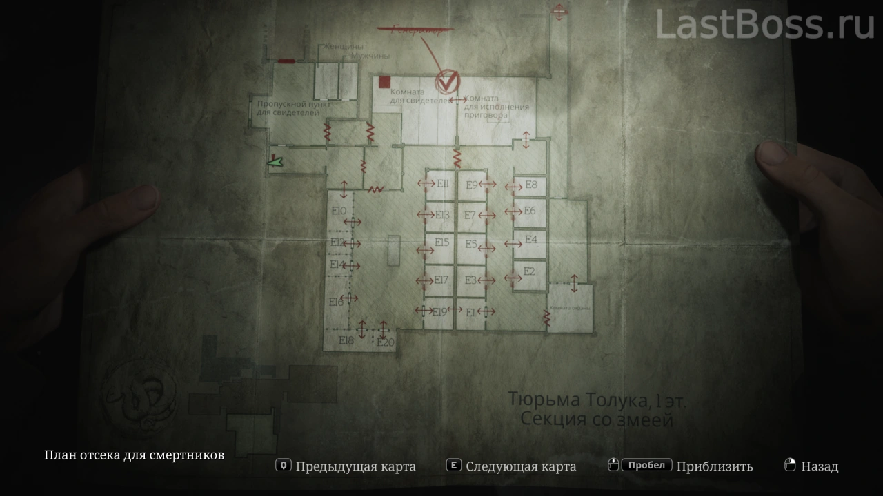 После перегрузки генератора в секции со змеей пройди в офис через щель в стене в камере Е10 — ключ висит в открытом шкафу.
