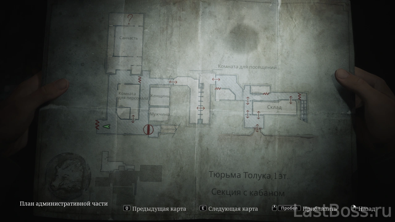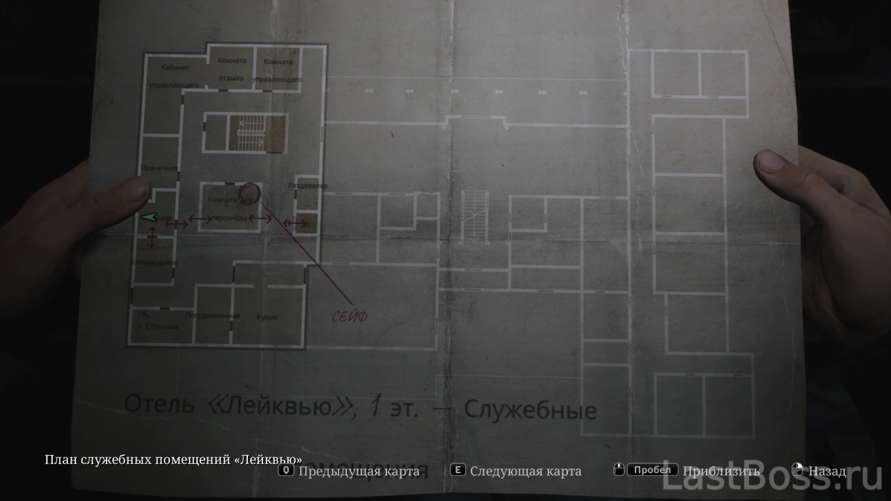 В комнате для персонала в секции с кабаном осмотри баррикадированные двери к юго-западу. На полу перед ними люк, покрытый воском. Это остаток странной головоломки оригинальной игры, где Джеймс использовал свечу, подкову и зажигалку, чтобы сделать ручку для люка.