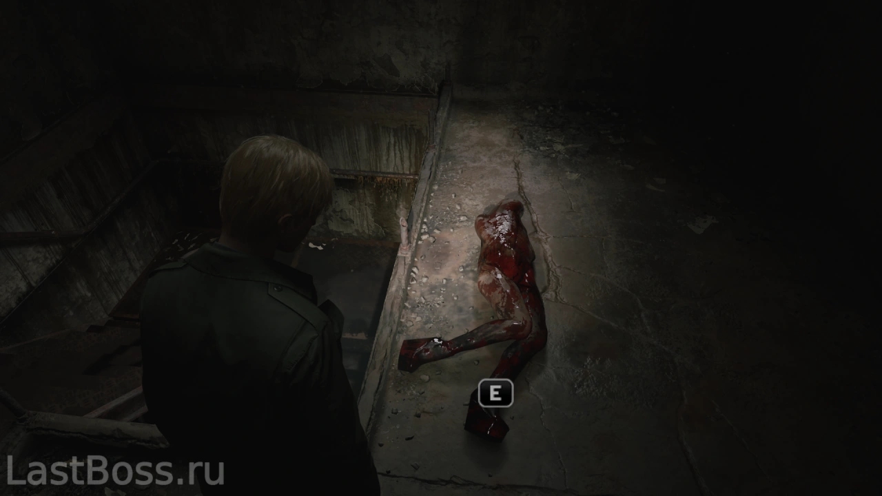 После успешной установки секундной стрелки в головоломке с часами вернись на лестничную площадку второго этажа и осмотри мёртвого монстра. Это место было сценой первой битвы с Пирамидоголовым в оригинале.
