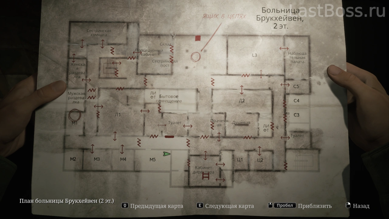 Осмотри цепь на кровати в комнате M1 на втором этаже больницы Брукхейвен. Это отсылка к головоломке из оригинального SH2, на которой основана головоломка ящика в цепях в ремейке. Ящик в ремейке имеет только 3 замка, поэтому эта головоломка была убрана.