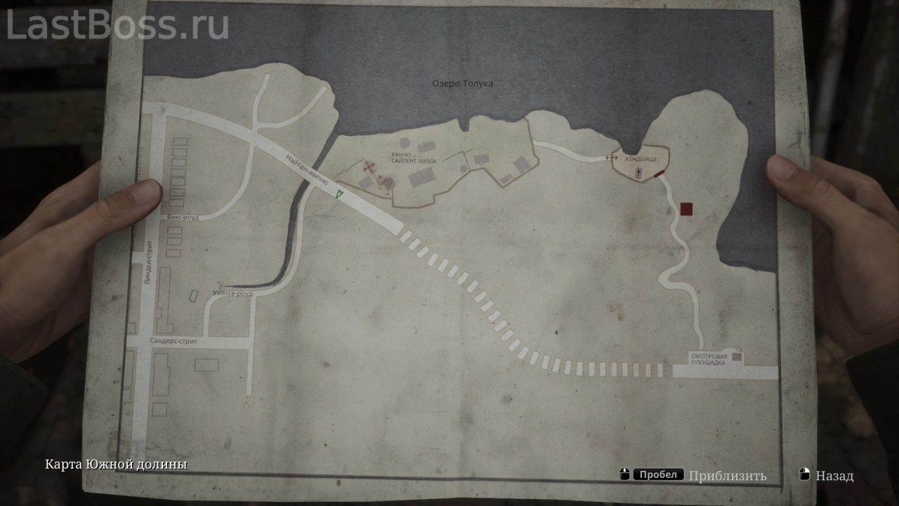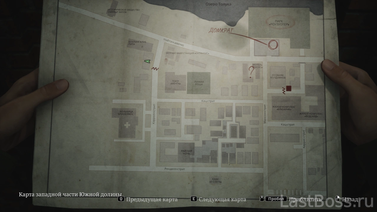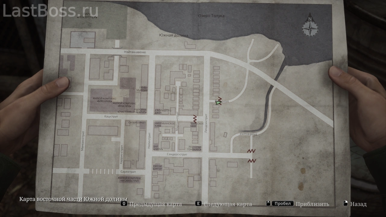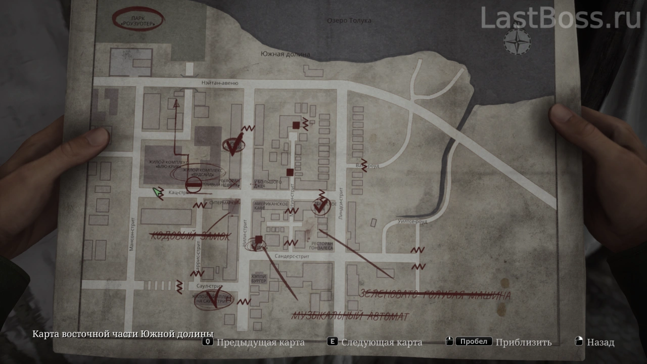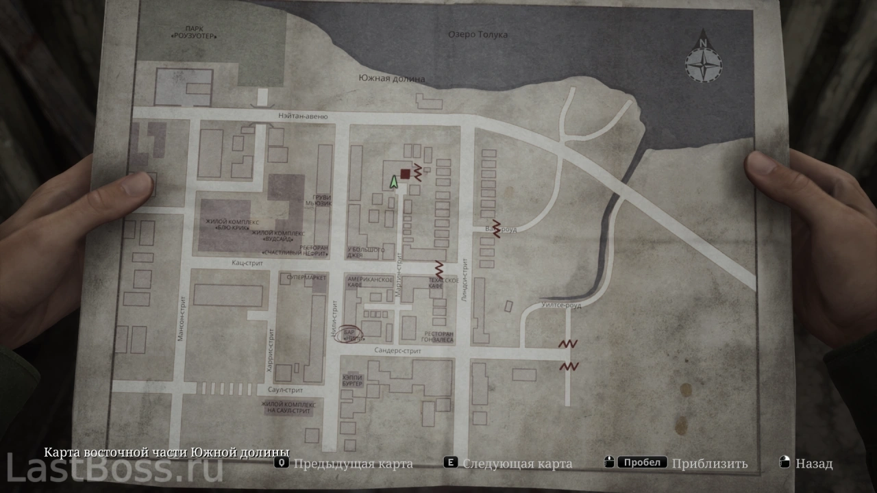 Возвращаясь в восточную сторону Южной Долины, загляни снова в бар Нили и найди чужую карту города. Похоже, что кто-то повторял маршрут Джеймса в обратном порядке…?