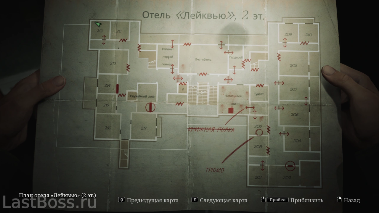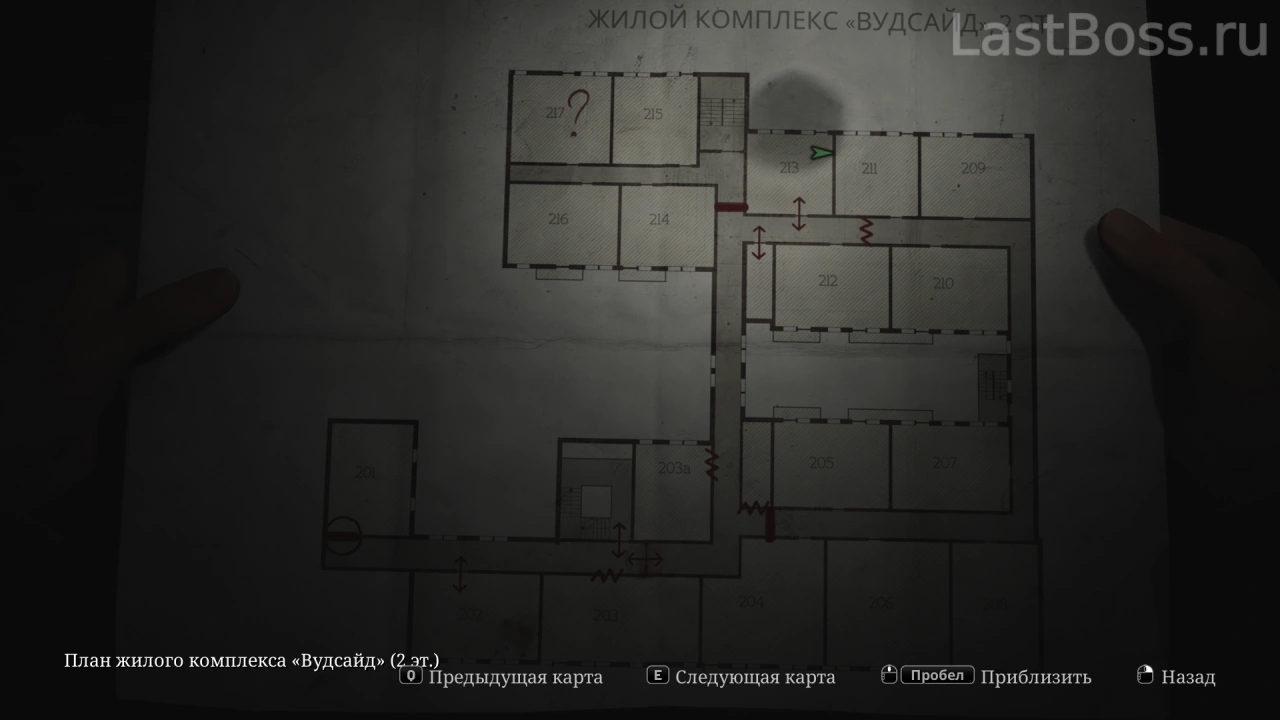 Осмотри поцарапанную стену в спальне апартаментов 213. Когда заходишь впервые, здесь темно, поэтому легко пропустить. После получения пистолета, телевизор подсветит комнату, и отзвук станет проще заметить. Это отсылка к оригинальной головоломке с часами, которую в ремейке перенесли в Блю-Крик.
