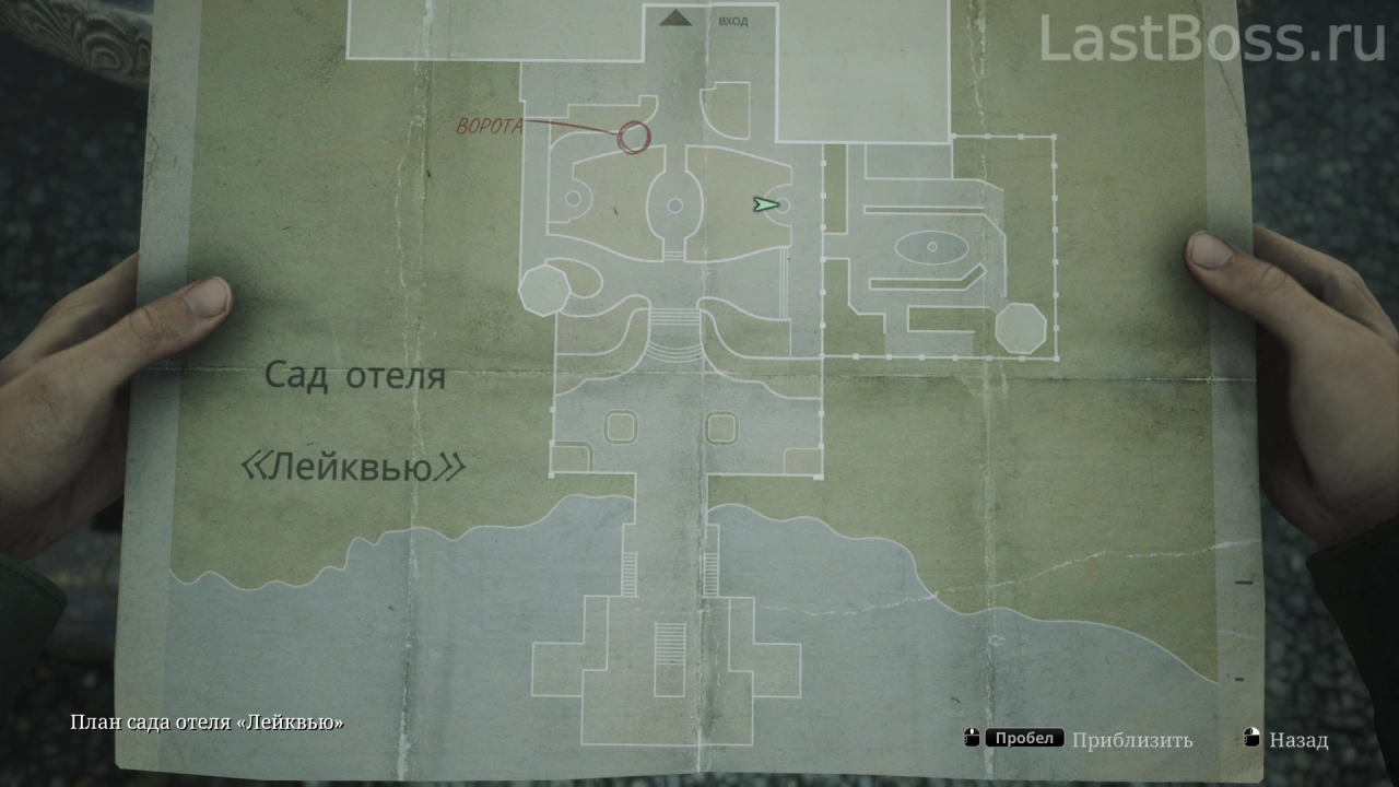 В саду перед главным входом в отель Лейквью поверни направо: в декоративном фонтане с фигуркой рыбы найдёшь сломанную статуэтку. Это один из трёх объектов для решения головоломки с музыкальной шкатулкой в оригинале. В ремейке она заменена на простую фигурку.