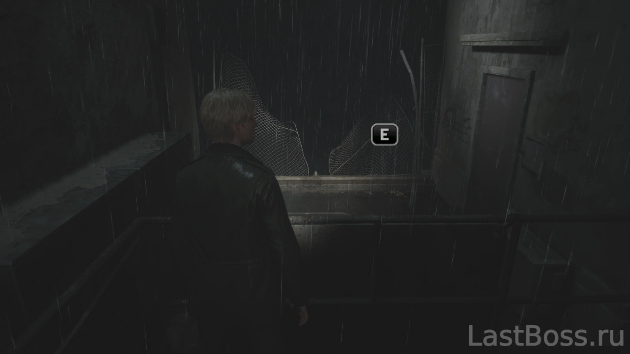 На крыше больницы темно и льет дождь, поэтому сложно заметить, но можно пройти по дорожке рядом с дверью и осмотреть поврежденную часть забора. В оригинале Джеймс был выброшен через этот забор и упал в Специальную лечебную комнату, а в ремейке Пирамидоголовый сбрасывает его через крышу лифтовой шахты.