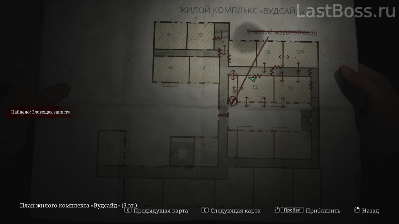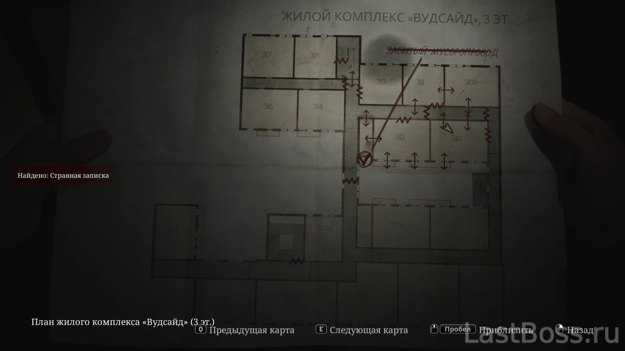 На третьем этаже половина квартиры 310 заблокирована обломками. Пройдя по коридору, можно найти дыру в стене, чтобы обойти препятствие. Записка лежит в ящике стола.