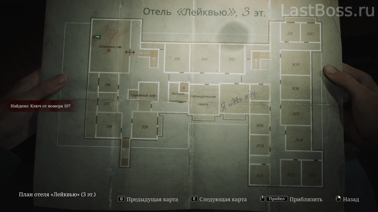 После получения ключа вернись на первый этаж отеля и открой комнату 107. Записка прямо перед тобой при входе.